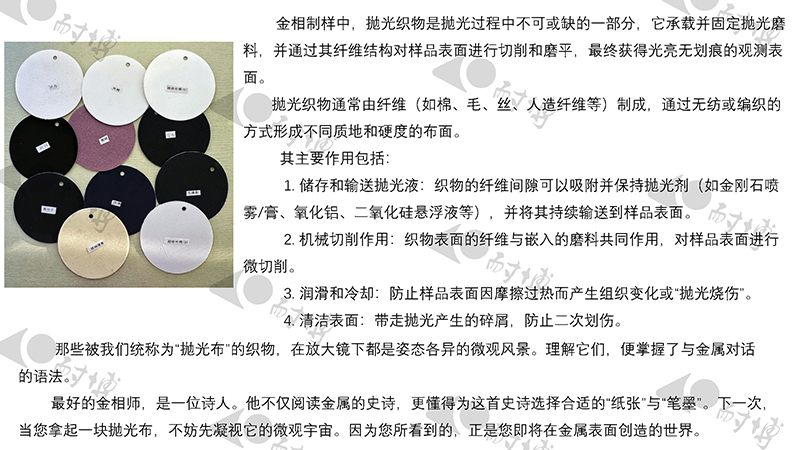 在金相制样中,抛光织物作为抛光过程中不可或缺的一环,不仅承载并固定抛光磨料,更借助其独特的纤维结构对样品表面进行精细切削与磨平,是实现光亮无划痕观测表面的关键所在。