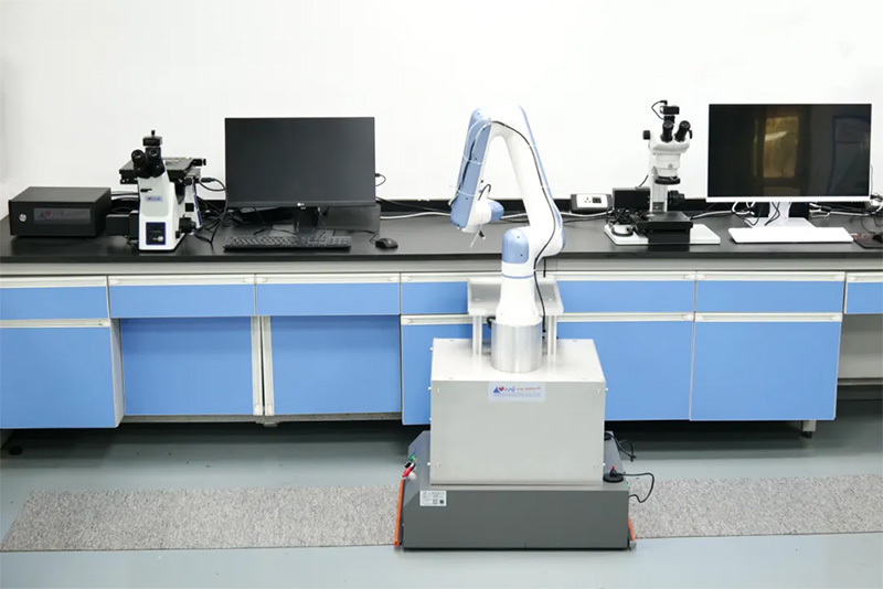 无人显微实验室实现全自动化检测,智能机械臂精准配合耐博全自动金相显微镜,实现自动抓取样品、自动聚焦、样品台升降及移动平台等功能,大幅提升检测效率并消除人为误差,显著提升科研与工业检测效率。